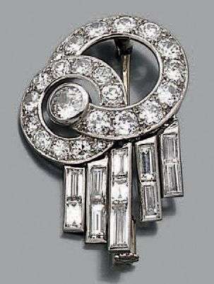 Petite broche en platine (950) et or gris 18k (750) composée de deux anneaux enlacés sertis de brillants et retenant des chutes de diamants baguettes.