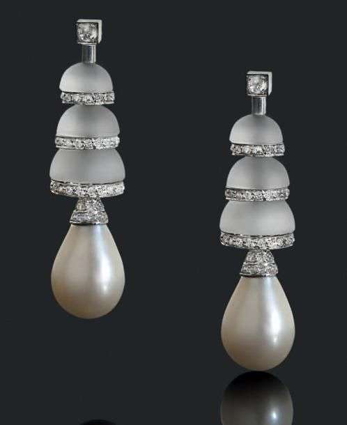 Paire de pendants d'oreilles en or gris 18k (750) composés d'une chute de demi sphères en cristal de roche dépoli soulignées d'un filet en platine serti de diamants et retenant en pampille une perle fine en goutte.