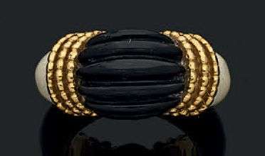 Bague en or jaune 18k (750) ornée d'un motif d'onyx gravé de godrons épaulé de trois lignes de perles en or et de motifs d'ivoire. Signée et numérotée.