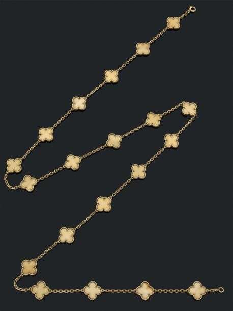Sautoir "Alhambra" en or jaune 18k (750) composé de motifs trèfles ornés d'ivoire.