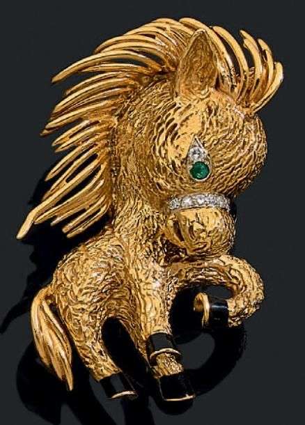 Clip "poney" en or jaune orné d'émail noir sur les sabots, d'une ligne de diamants et d'une émeraude pour l'oeil.