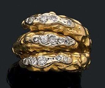 Bague en or jaune et gris 18k (750) martelé sertie de diamants de taille ancienne. Signée