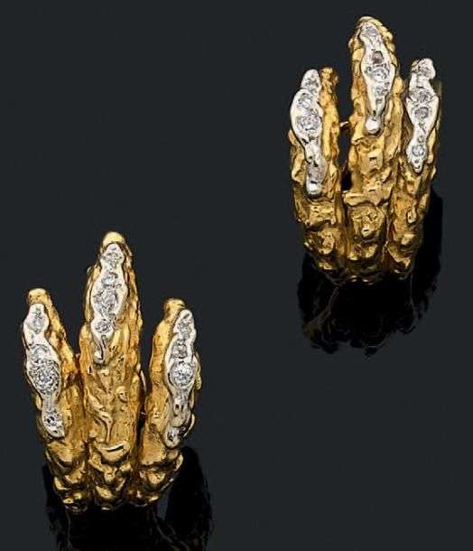 Paire de clips d'oreilles en or jaune et gris 18K (750) martelé sertis de diamants de taille ancienne.