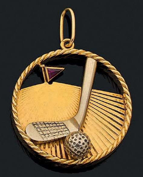 Pendentif "golf" de forme ronde en or jaune et gris 18K (750) ciselé d'un club et une balle sur le green rehaussé d'un rubis. Signé et numéroté.
