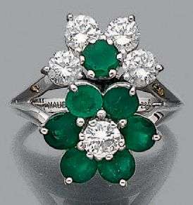 Bague en or gris 18k (750) composée de deux fleurettes serties de diamants et émeraudes. Signée et numérotée.