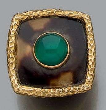 Bague en or jaune 18k (750) composée d'un motif carré d'écaille blonde dans un entourage en or martelé et serti au centre d'un cabochon de chrysoprase.