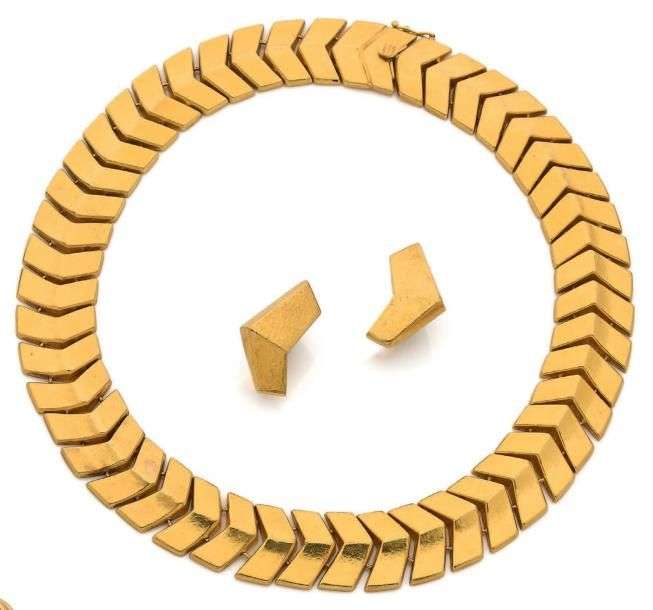 Parure en or jaune 18k (750) martelé comprenant un collier articulé et d'une paire de clips d'oreilles à motifs de chevrons. Signés
