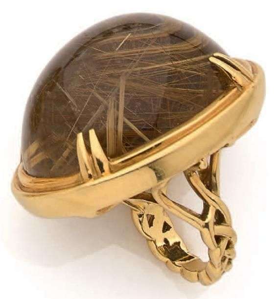 Importante bague en or jaune 18K (750) ornée d'un important cabochon de quartz rutilé.