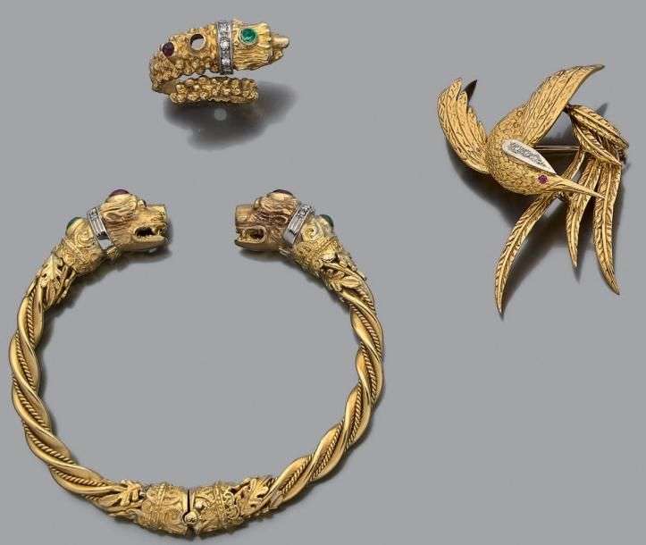 Ensemble composé de deux broches "oiseaux", l'une entièrement en or jaune