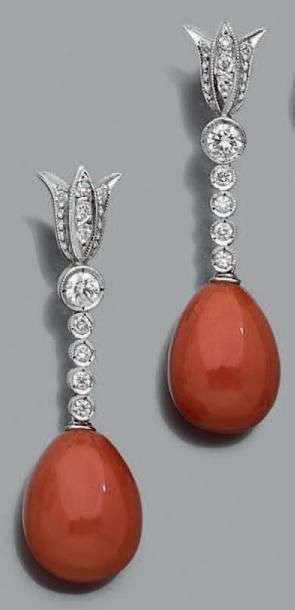 Paire de pendants d'oreilles en platine (950) sertis de diamants et ornés d'une perle de corail en pampille.