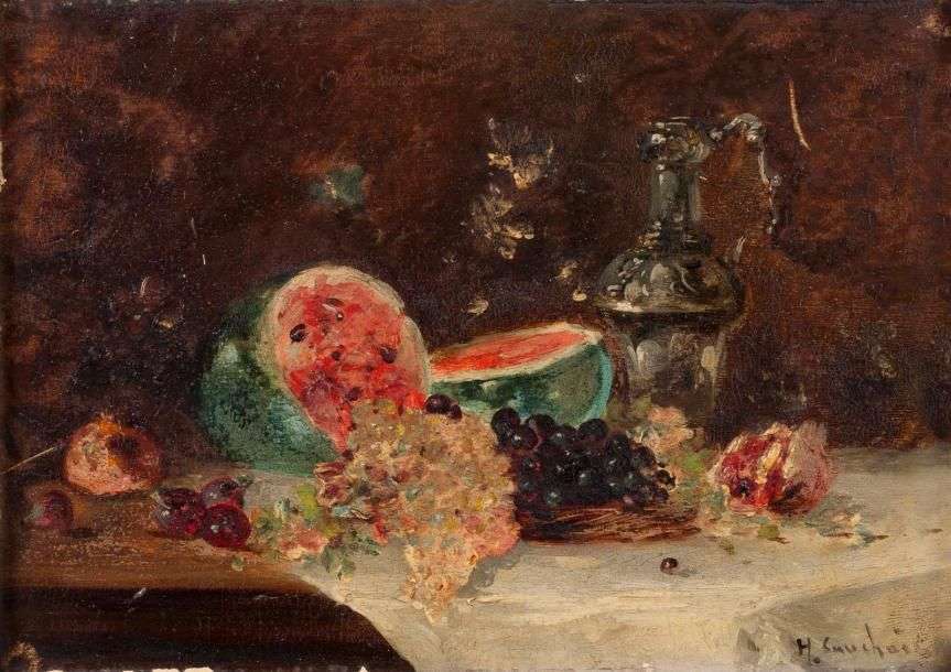 Nature morte aux raisins, pastèque et carafe de vin