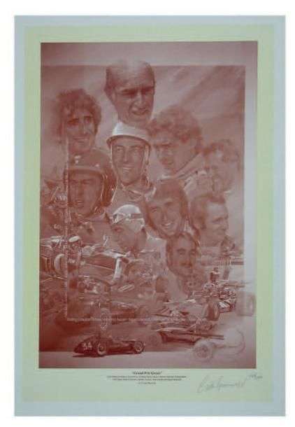 On joint un poster reprenant un dessin du même artiste représentant plusieurs pilotes de Formule 1