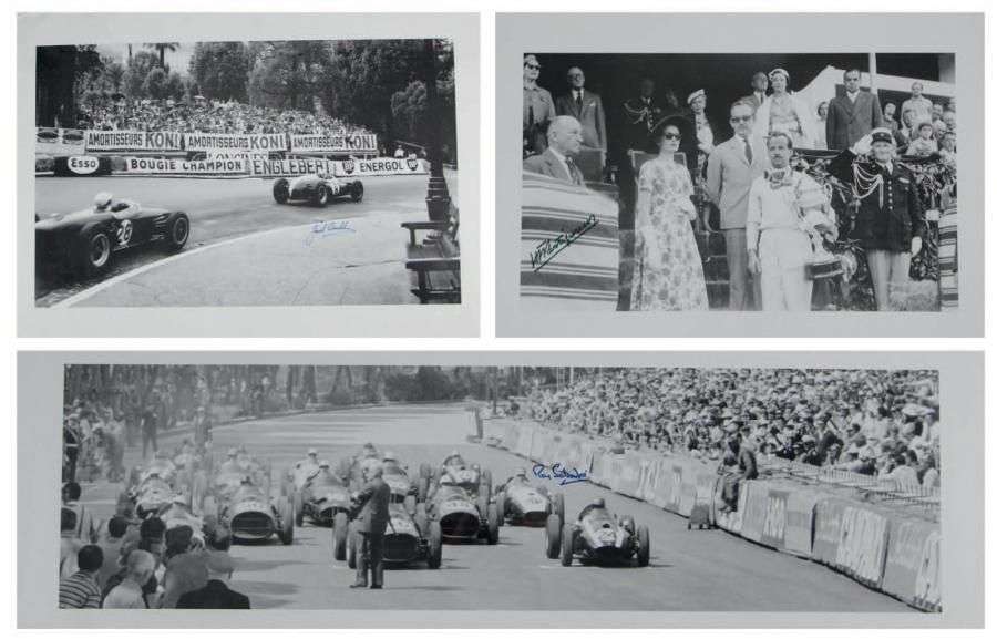 Lot de 3 posters reprenant des photographies en course dédicacées par Jack Brabham, Maurice Trintignant et Roy Salvadori