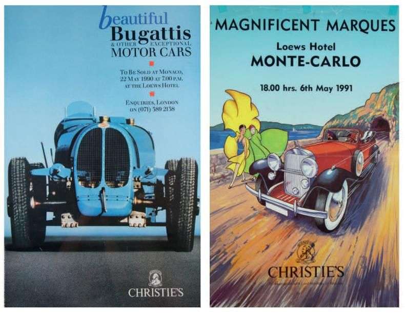 CHRISTIE'S Lot de deux affiches sur les vacations automobile de la maison de vente en principauté de Monaco en 1990 et 1991