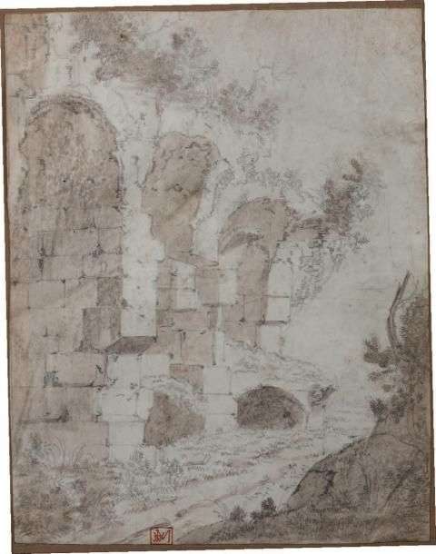 Plume et encre grise, lavis gris et brun sur traits à la pierre noire