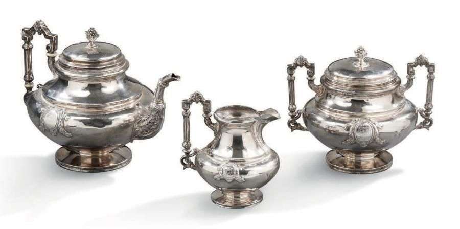 SERVICE À THÉ en argent à décor d'armoirie dans des médaillons rubannés, p