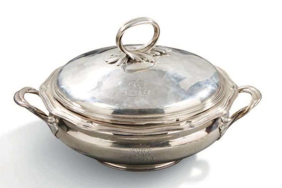 LÉGUMIER COUVERT en argent chiffré JG à décor de filets et contours.