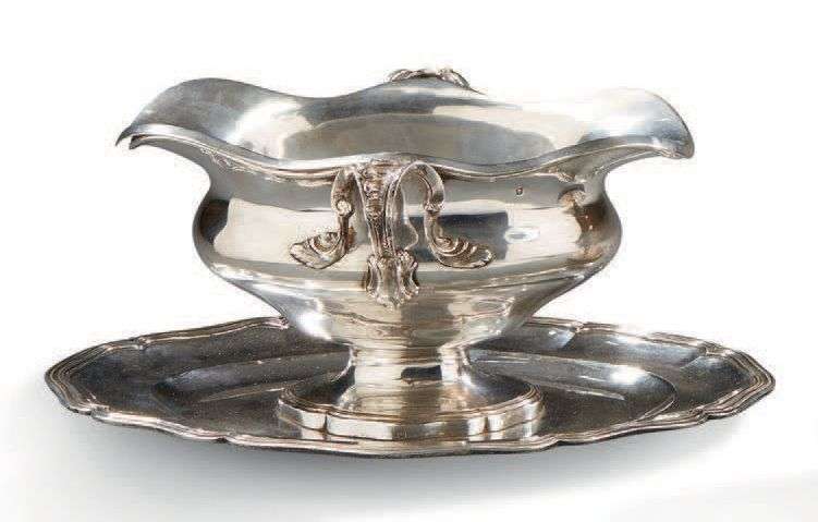 SAUCIÈRE ET SA DOUBLURE EN ARGENT chiffrée JG à décor de filets contours et anses feuillagées.