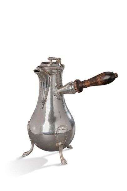 Verseuse en argent uni de forme balustre posant sur trois pieds coiffés de cartouches, le bec verseur souligné de cannelures et le manche latéral en bois tourné. Le corps est orné d'une armoirie surmontée d'une couronne comtale.