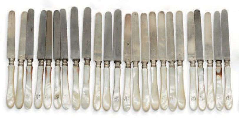 ENSEMBLE comprenant vingt-quatre couteaux manche en nacre chiffré JG: