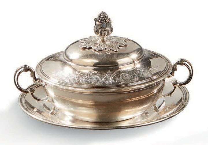 PETIT BOUILLON COUVERT ET SON PRÉSENTOIR en argent, à décor ciselé de rinceaux feuillagés.