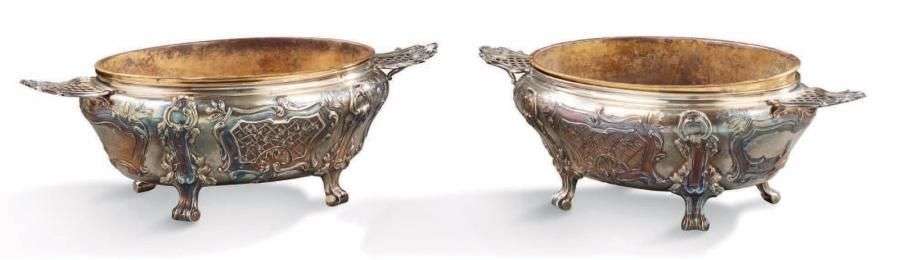 PAIRE DE PETITES JARDINIÈRES en argent à deux anses ajourées de treillage.