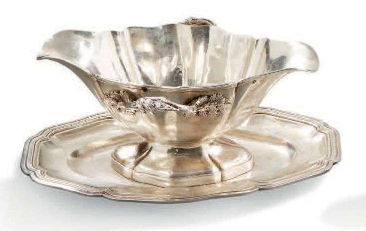 SAUCIÈRE EN ARGENT ARMORIÉ ET SON PRÉSENTOIR de forme chantournée. Les anses feuillagées.