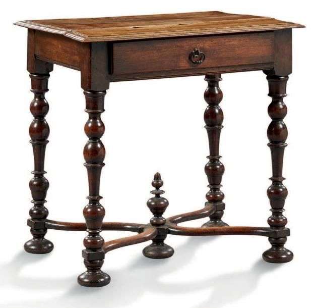 PETITE TABLE de forme rectangulaire en noyer, elle ouvre par un tiroir en ceinture et repose sur quatre pieds tournés réunis par une entretoise en «X». Pieds poule aplatis.