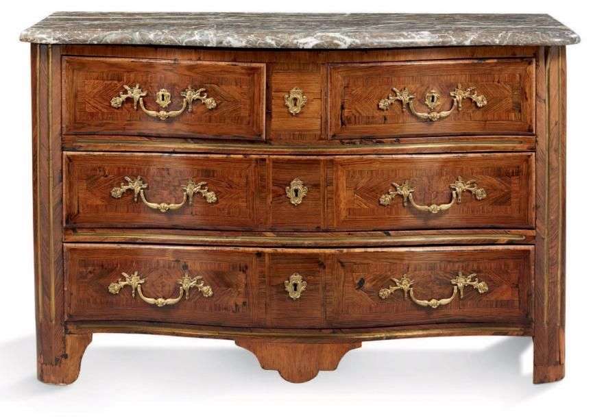 COMMODE de forme légèrement galbée en marqueterie de bois de placage. Elle ouvre par quatre tiroirs sur trois rangs, les montants arrondis à cannelures foncées de laiton. Ornementation de bronzes dorés et ciselés.