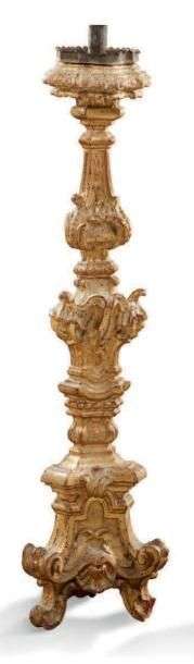PAIRE DE PIQUES-CIERGE en bois mouluré, sculpté et doré à décor d'acanthes et d'enroulements.