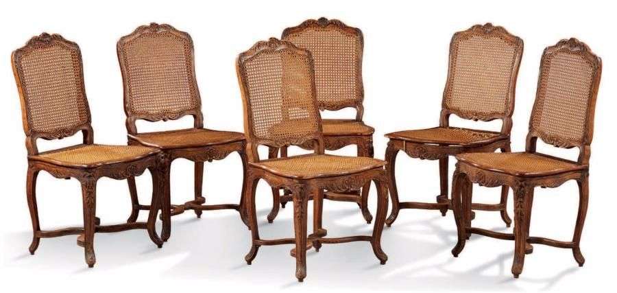 SUITE DE SIX CHAISES cannées en bois naturel mouluré et sculpté à décor de coquilles, acanthes et étoiles dans des croisillons.