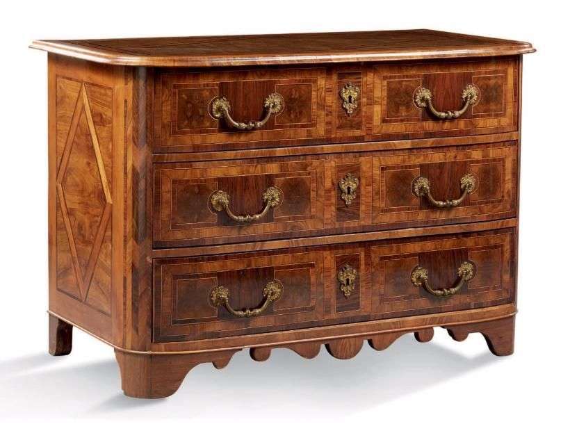 COMMODE en placage de noyer et ronce de noyer. Elle ouvre par trois tiroir