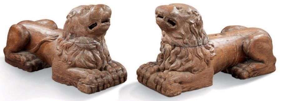 PAIRE DE LIONS STYLOPHORE en chêne naturel sculpté.