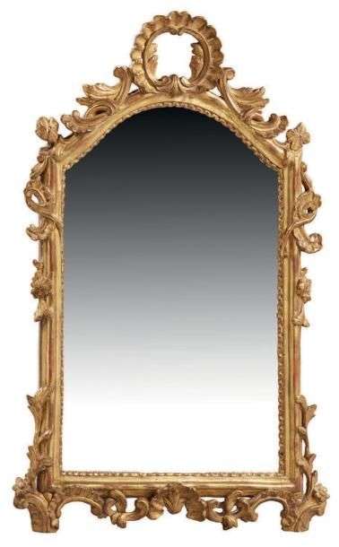 MIROIR en bois mouluré sculpté et doré à décor d'une large coquille ajourée, fleurettes et acanthes.