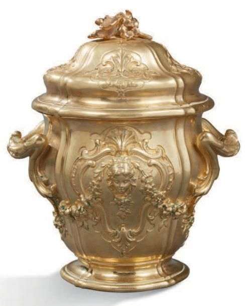 POT COUVERT en bronze ciselé et doré à décor de lambrequins, masques de femmes dans des réserves chantournées, réunies par des guirlandes de fleurs. Deux anses à décor d'acanthes et prise de fleurs.