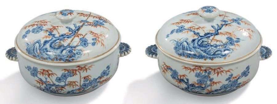 PAIRE DE TERRINES COUVERTES en porcelaine à décor imari de bambous et bran