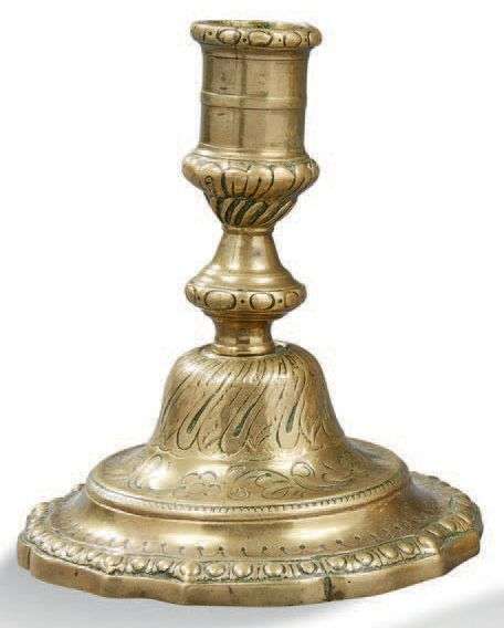 PAIRE DE PETITS BOUGEOIRS en bronze ciselé et doré à décor d'oves, festons, acanthes et fleurettes.