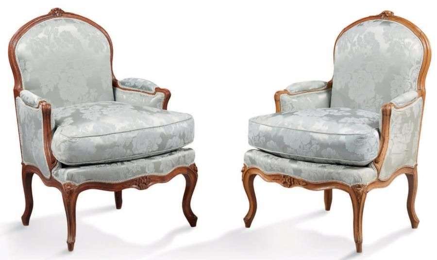 DEUX BERGÈRES formant paire en bois naturel mouluré et sculpté à décor de fleurettes. Bras et pieds cambrés.