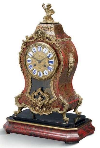 CARTEL de forme violonnée en marqueterie de style Boulle, ornementation de bronze ciselé et doré.