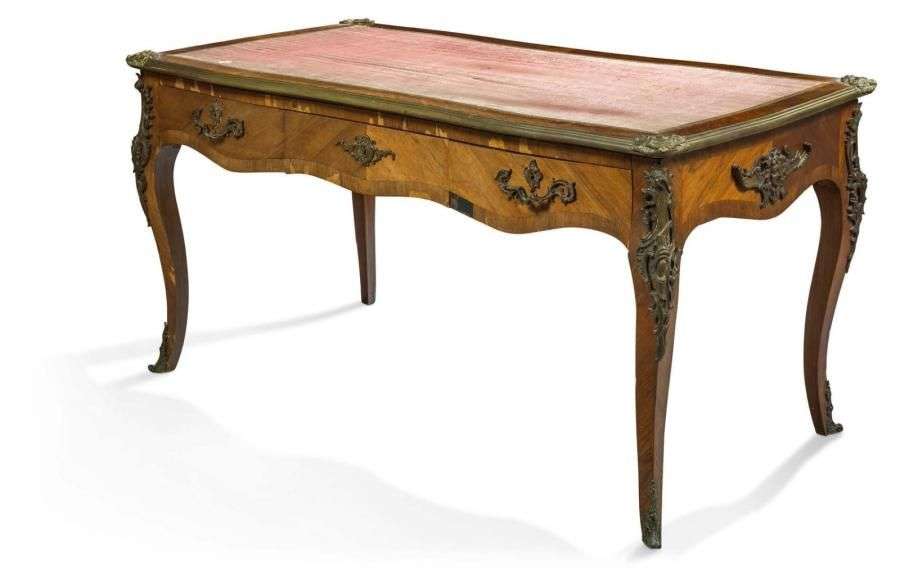 BUREAU PLAT en marqueterie de bois de placage, il ouvre par trois tiroirs sur une face et repose sur des pieds cambrés. Ornementation de bronze ciselé et doré, plateau ceint d'une lingotière avec écoinçons.