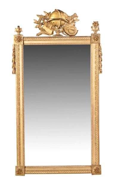 GRAND MIROIR de forme rectangulaire en bois sculpté et doré de frises d'entrelacs, rais-de-coeur et rangs de perles. Les montants ornés de chutes de feuillages et surmontés de vase à l'antique. Le fronton à décor d'une sphère armillaire et d'instruments de musique.