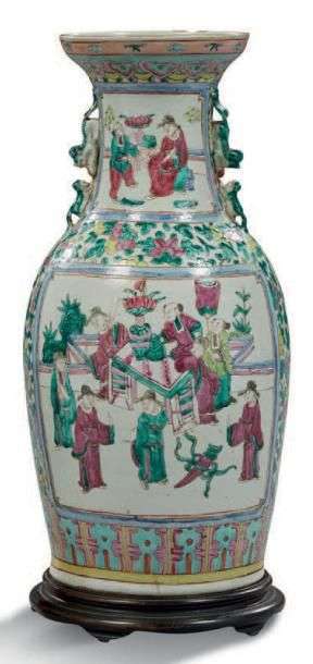 PAIRE DE VASES à col évasé en porcelaine polychrome à décor de fleurs et de personnages dans des réserves.