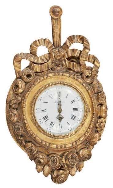 CARTEL en bois doré à décor de roses et surmonté d'un noeud de ruban.