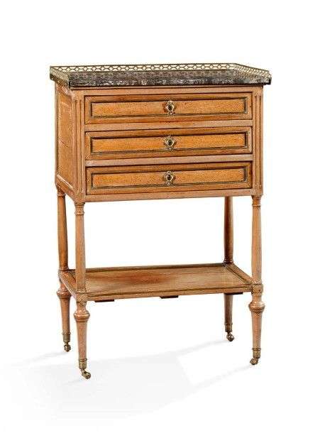 Elle ouvre par trois tiroirs ornés de moulures de laiton en facade.
