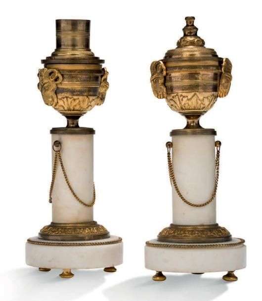 PAIRE DE CASSOLETTES en bronze ciselé, doré et marbre blanc, à décor de têtes de bélier.