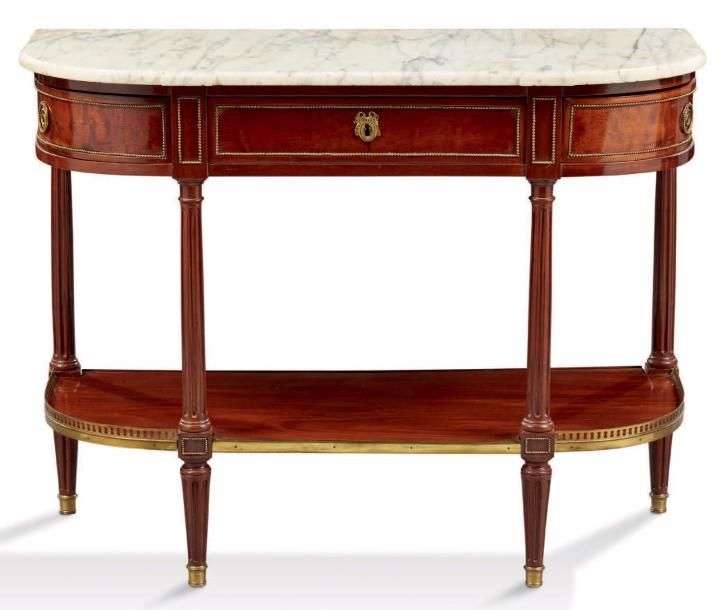 CONSOLE de forme demi-lune en acajou et placage d'acajou, elle ouvre par trois tiroirs en ceinture, ornés de rangs de perles. Montants et pieds fuselés à cannelures réunis par une tablette d'entretoise à galerie.