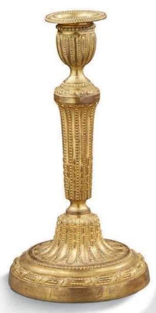 PAIRE DE BOUGEOIRS en bronze ciselé et doré, le fût à décor de cannelures à asperges et rangs de perles.