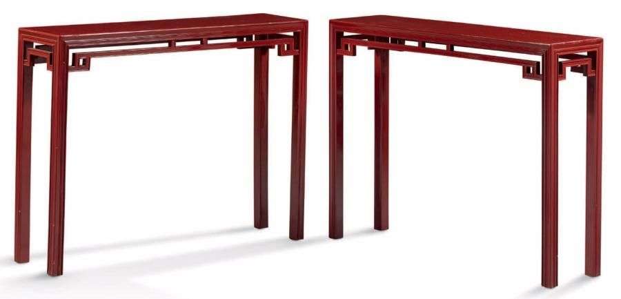 PAIRE DE CONSOLES décoratives dans le goût chinois en bois laqué de couleur sang de boeuf.