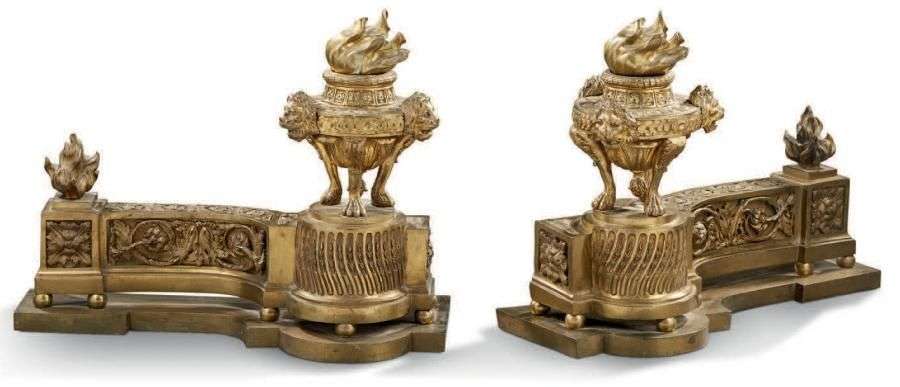 IMPORTANTE PAIRE DE CHENETS en bronze ciselé et doré, ornés de pots à feu, en forme d'athénienne.