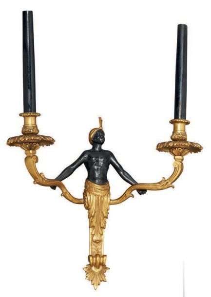 PAIRE D'APPLIQUES à deux bras de lumières en bronze doré et patiné noir à décor de torses de nubiens coiffés d'un turban.